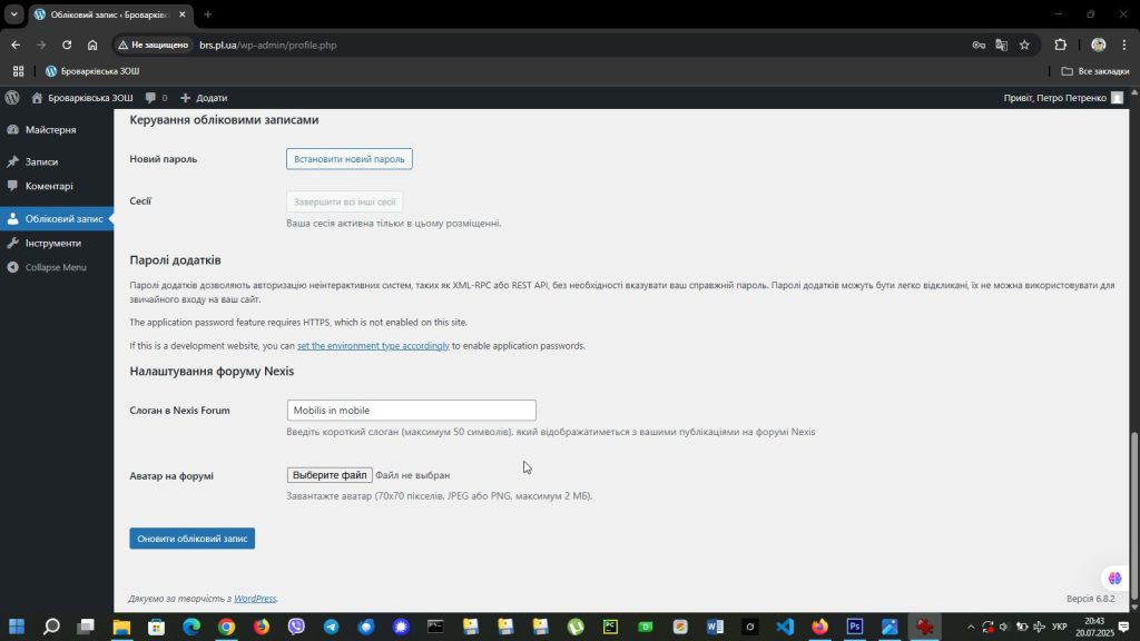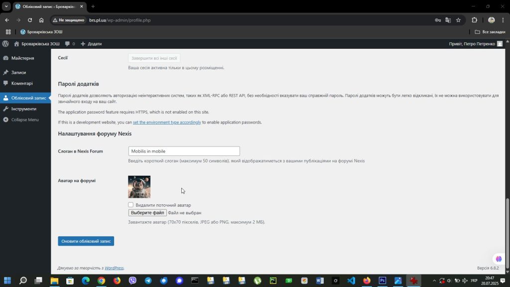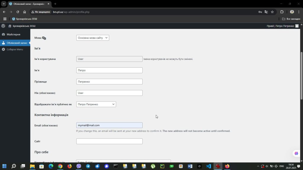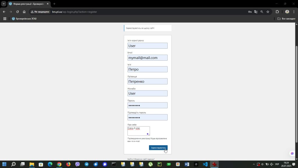 - Поле “Про себе” – інформація про ваш статус. Це може бути наприклад “Учень 8 класу”, “Класний керівник 5 класу”, “Батьки учня 7 класу”, “Гість” … тощо. Ця інформація потрібна для визначенні рівня доступу до ресурсів сайта.